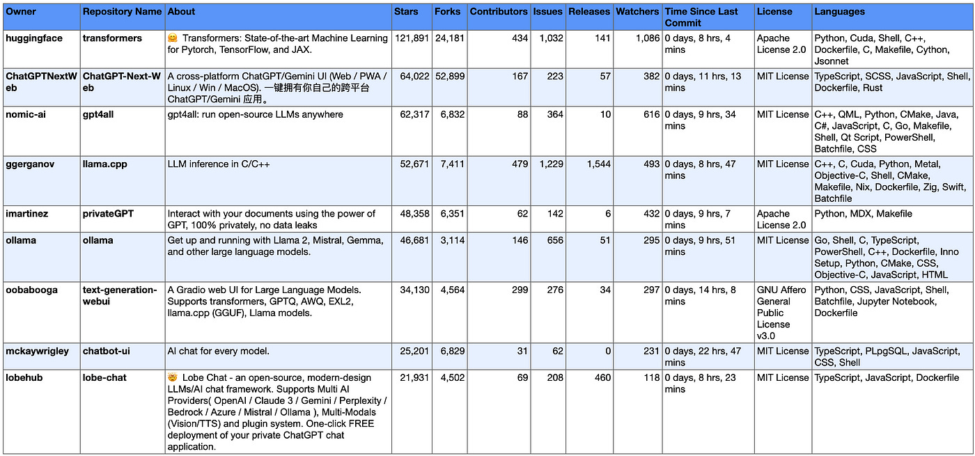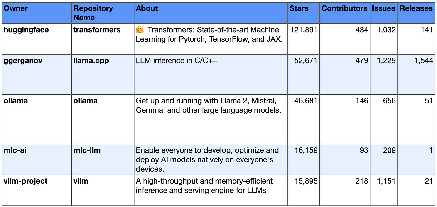 Each section includes a table of relevant open-source LLM GitHub repos and to gauge popularity and activity. Click here for the full table and here for associated GitHub repo.
